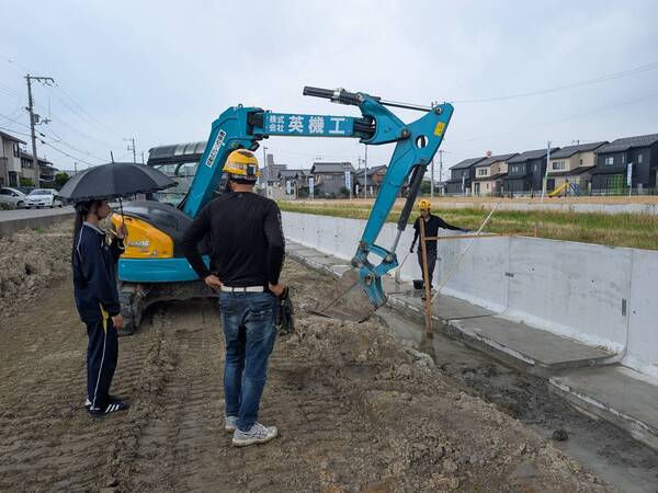 現場見学では、施工途中の図面からL型擁壁・側溝の位置を確認、隣接する完成現場と